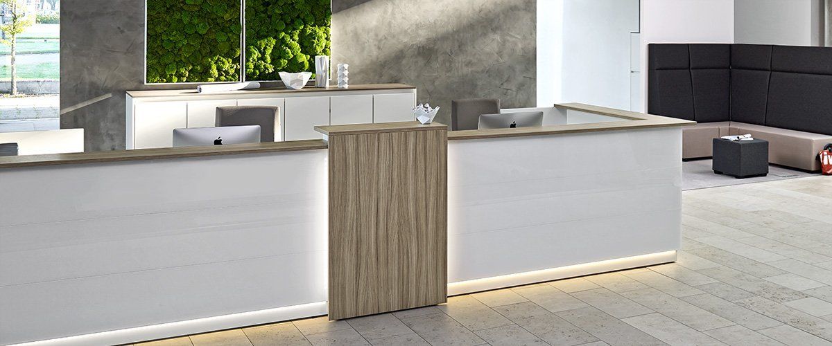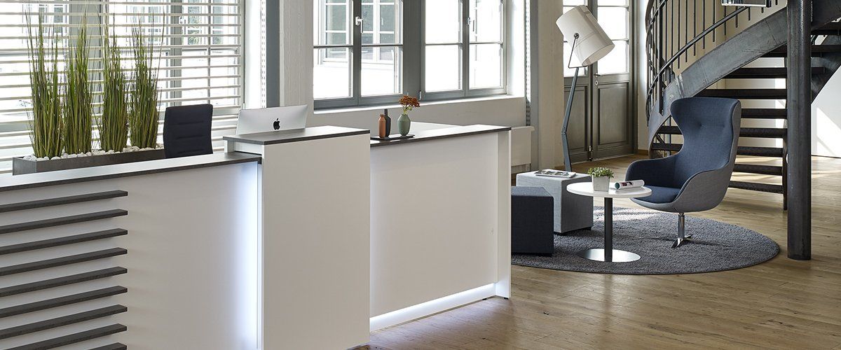 Im Firmenfoyer oder Showroom, in Büros mit Kundenkontakt, als Anlaufpunkt im Open Space oder als Counter in Praxis und Kanzlei spielt die Empfangstheke eine Hauptrolle. Sie heißt Besucher willkommen und repräsentiert die Unternehmenskultur, ist aber zugleich auch Arbeitsplatz mit ergonomischen Anforderungen. Das Empfangsthekenprogramm bietet beste Voraussetzungen für die perfekte Erfüllung dieser Doppelfunktion.