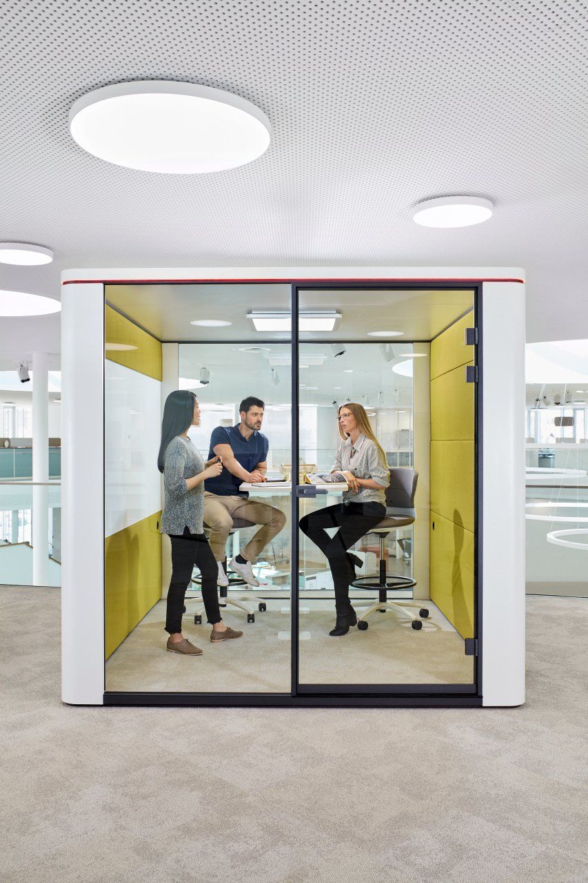 Und wie sieht es mit konzentriertem Arbeiten aus? Für bestimmte Aufgaben sind Fokus, Ruhe und etwas Distanz zum Umfeld notwendig. Eine Möglichkeit sich von äußeren Einflüssen abzugrenzen und Störgeräusche „draußen“ zu lassen, ist die Office-Cube-Lösung. Es gilt jedoch auch umgekehrt: Wo können Treffen in kleiner Runde stattfinden oder Telefonate geführt werden, ohne dabei andere zu beeinträchtigen?
